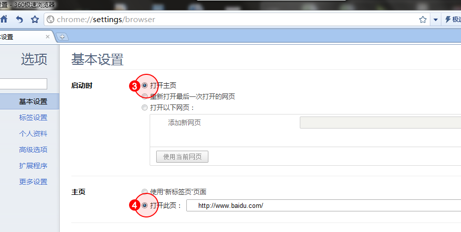 2.在"啟動時"項,確認點選"打開主頁"。在"主頁","打開此頁"項目后的框中輸入"www.ningfcw.cn" ,設置成功。