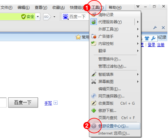 1.點擊"工具"菜單,選擇"遨游設置中心"。