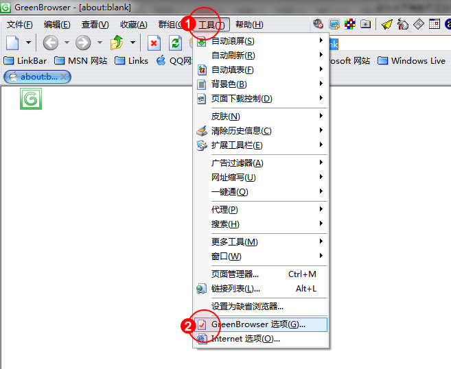1.選擇"工具"菜單,點擊GreenBrowser選項。