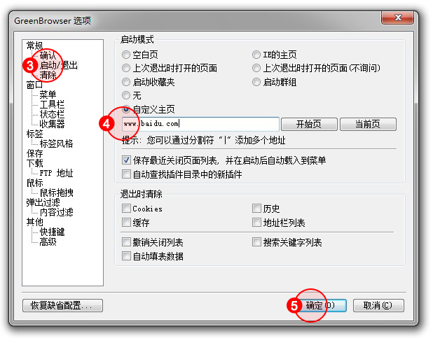 2.在左邊欄選擇"啟動/退出"項,點選"自定義主頁"并輸入"www.ningfcw.cn",點擊確定,設置成功。