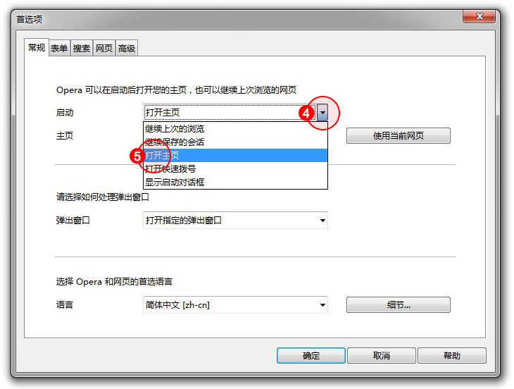 2.點擊"啟動"項的文字框,選擇"打開主頁"。