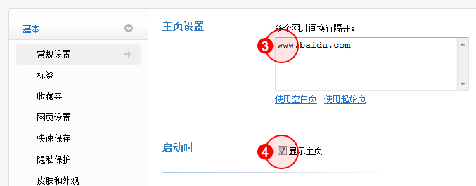 3.選擇"啟動時打開"-“主頁”,點擊“修改主頁”按鈕,在彈窗中點擊“使用百度”,再點擊“確定”按鈕即可 。